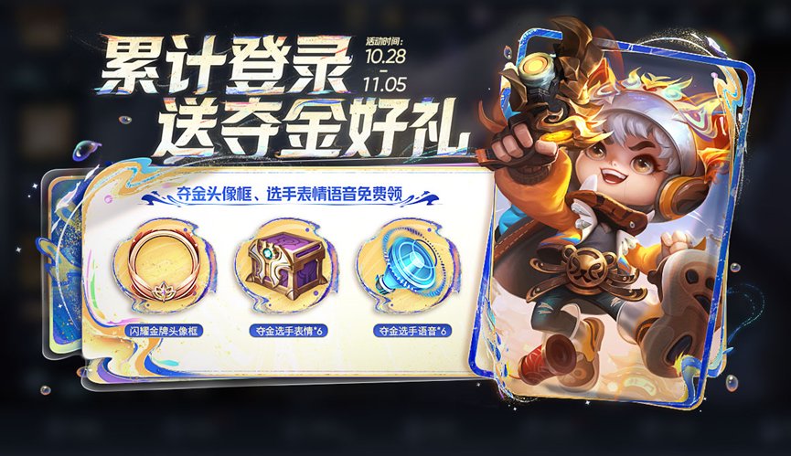 累计签到送闪耀金牌头像框、夺金选手语音礼包、夺金选手表情礼包好礼!