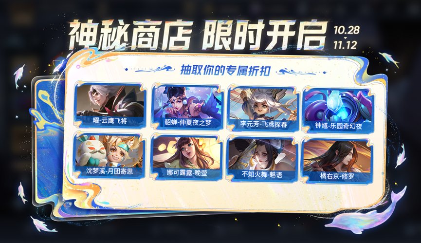 李元芳-飞鸢探春、钟馗-乐园奇幻夜、沈梦溪-月团寄思首次加入神秘商店,更有曜-云鹰飞将、貂蝉-仲夏夜之梦、娜可露露-晚萤、不知火舞-魅语、橘右京-修罗等人气皮肤享受幸运折扣。