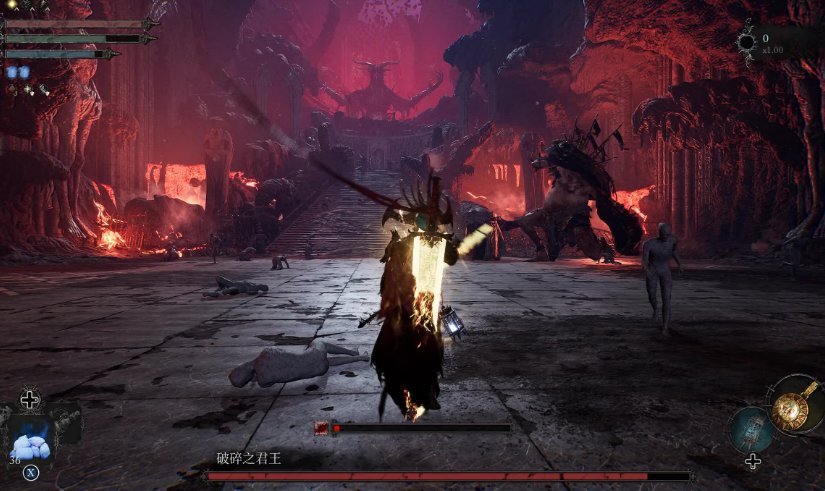 破碎君主是一个巨人。 他在战斗开始时跪在角落里,让你跑进去并获得战斗的第一击。 如果你这样做,请注意他可以向后滑动的手和可以快速燃烧并积累燃烧的AoE Slam攻击。 在这个阶段的大部分时间里,除了一些基本的动作之外,他通常会待在角落里无所事事。 其他攻击包括标准的拳头猛击和拳击。 第二阶段(或战斗的真正开始)将在你开始攻击后不久开始。 在受到几次攻击后,一个场景将开始揭示他手臂的再生以及他与雕像的互动。