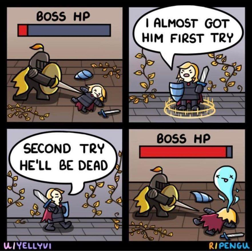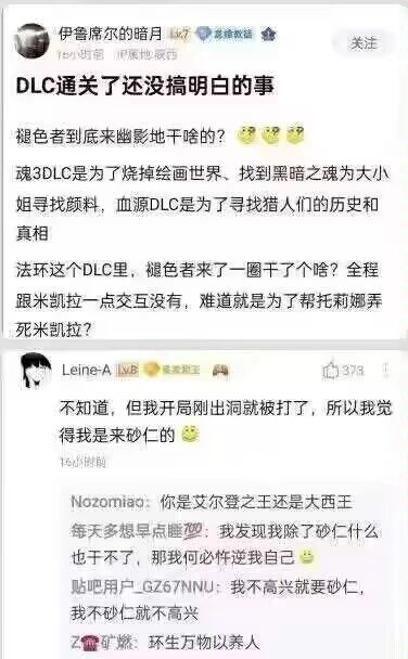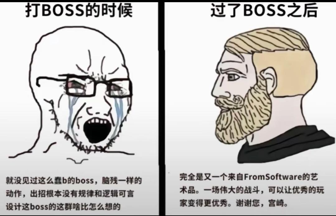 还有形象展示受苦坐牢时与通关Boss后的双标时刻的。我觉得这个是非常形象的,因为随着各种“逃课轮椅”被研究出来,我明显能感觉到DLC的口碑上升了一点点,也许人类的本质就是双标怪吧。
