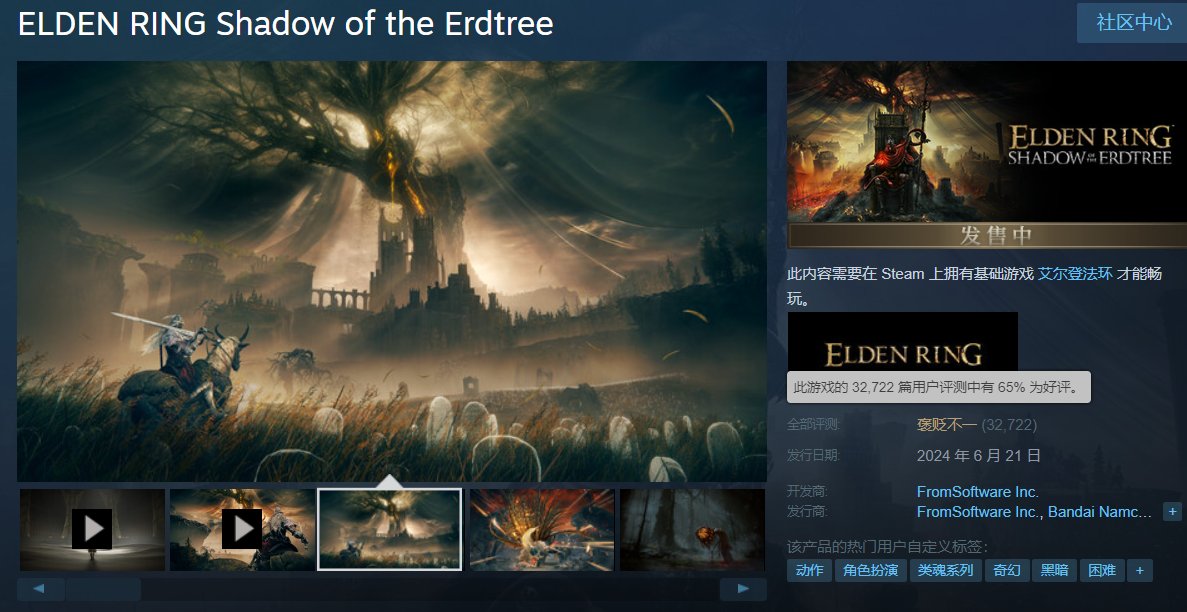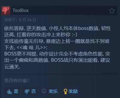 在数值设计离谱,Boss读指令严重,沟槽的快慢刀等等大粪设计下,黄金树之影在Steam上的好评率已经跌到了65%(褒贬不一),有一句差评我个人认为评价的非常应景和客观:这DLC让人赢得不清不楚,死的干脆利落。