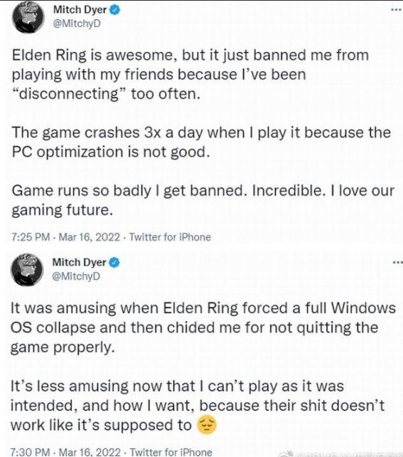 他表示:“《艾尔登法环》非常棒,但它刚刚禁止我和朋友一起玩,因为我掉线过于频繁。我玩该作时,每天崩溃三次以上,因为PC版优化不行,运行很糟糕。而官方因此把我ban了,真是让人难以置信。”