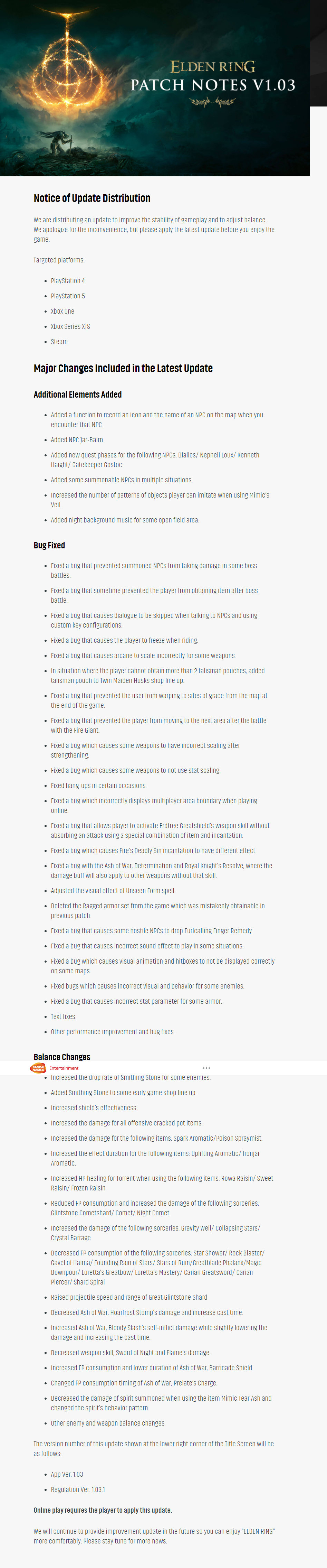 《艾尔登法环》今日发布1.03版本,该版本将登陆本次世代主机及PC平台。