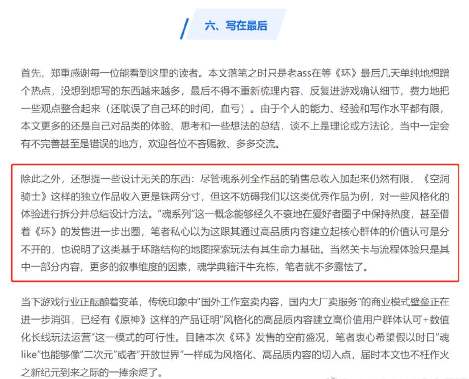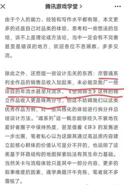 可能是觉得表述有些踩一捧一,这句话已经进行了删改,目前改为了“尽管魂系列全作品的销售总收入加起来仍然有限”,取消了与鹅厂的流水对比。