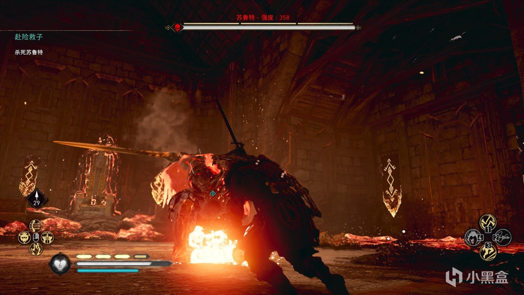这个流程更像是一个dlc的试玩demo,帮助玩家快速了解这个世界,并体验与入侵者“火巨人”的首领“苏鲁特”之间的战斗。与一些本体中的传说生物相比,苏鲁特庞大的体型,以及释放岩浆对角色造成持续性伤害的特殊攻击,确实有让我感受到不属于本体世界的强大压迫感。