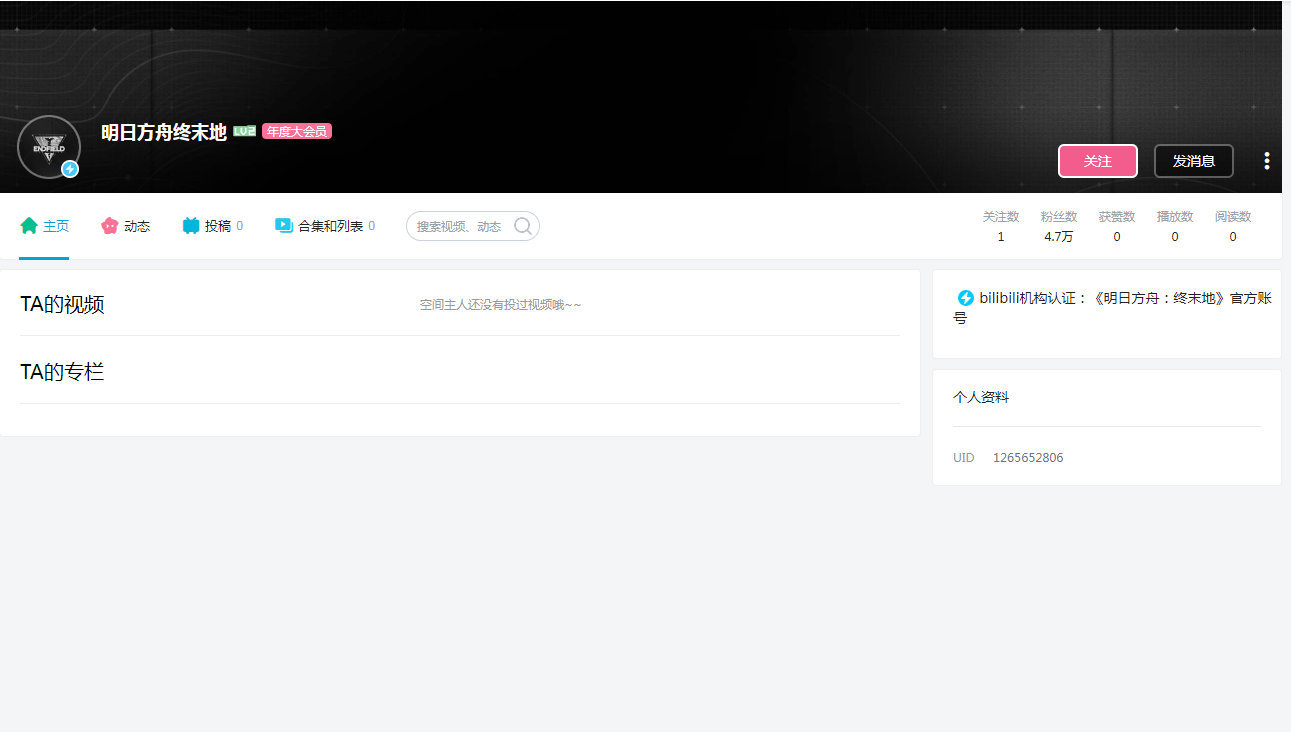 目前《明日方舟:终末地》已开通B站官方账号,不过没有发布任何内容。