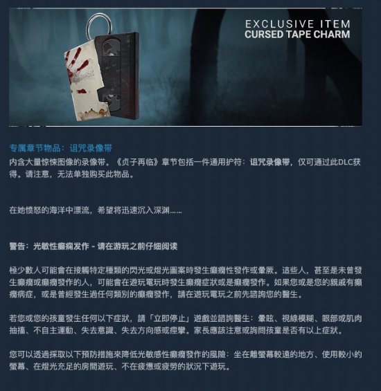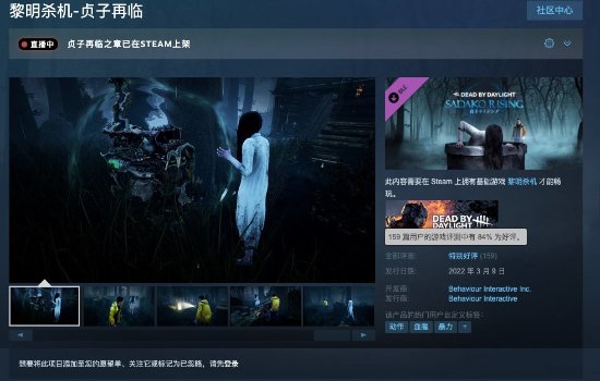 《黎明杀机》新DLC“贞子再临”现已正式上架Steam商城,目前玩家口碑为特别好评(好评率84%),售价38港币(约为30.67元)。游戏本体也已开启周末特惠,仅售38.34元。
