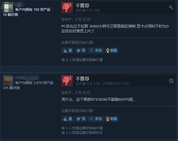 不少的玩家在Steam平台中反馈问题,游戏中遇到的问题包括丢帧、黑屏、白屏、连不上服务器闪退等,甚至一万多元的3090显卡也无法稳定在60帧。