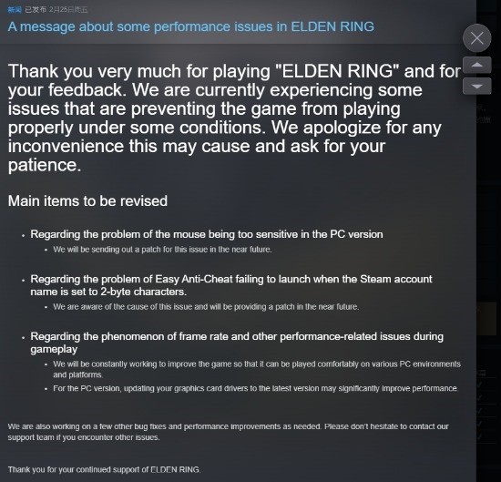 《艾尔登法环》于昨日在PC端正式解禁,但由于其“帧率无法稳定”、“白屏、闪退”、“无法使用控制器”、“反作弊系统误ban”等原因,其Steam评价仅为褒贬不一。