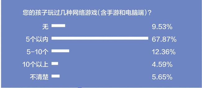 本次调查问卷中所指的网络游戏,包括端游和手游。调查结果显示,有过半的学生玩过网络游戏;其中有48.66%的学生表示自己玩过5个以内的网络游戏,也有34.50%的学生表示没有玩过网络游戏。与学生问卷反映的情况相比,表示孩子玩过游戏的受访家长占比超过八成,其中67.87%的受访家长表示孩子玩过的游戏数量不超过5款,12.36%表示玩过5-10款。