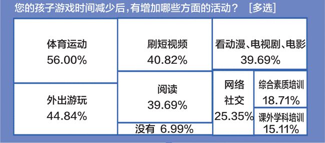 孩子游戏时间减少后,有增加哪些方面的活动?调查发现,62.21%的学生增加了体育运动时间,占比居首;紧接着则是阅读和外出游玩,所占比例分别为49.69%和40.33%。家长方面,过半数受访家长反映孩子参加体育运动的机会增多,占比最高,其次是外出游玩,占44.84%;还有40.82%表示孩子刷短视频的时间也有所增加。