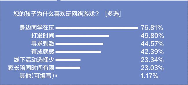 那么,未成年人为什么玩游戏?结果显示,“身边同学在玩”这一从众心理是影响中小学生玩网络游戏的首位重要原因,76.81%的受访家长以及43.03%受访学生均认同该观点,占比最高;其次是“打发时间”“寻求刺激”以及“有成就感”。