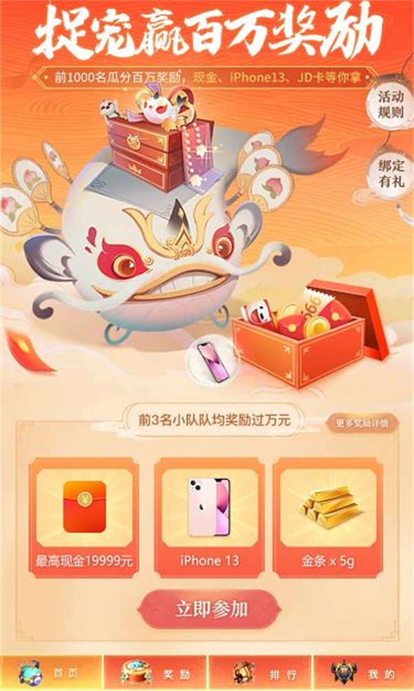 活动期间,驭灵师通过组队形式参加活动,1-4人组队均可,组队后参与“捉宠排行榜”活动瓜分大奖,排行榜的排名由小队所有人的“个人积分”总和决定;而“个人积分”由“捉BOSS积分”加“当日最新宠物评分”共同决定。捉宠排行最高的驭灵师小队可获得19999元现金、金条5g、玄中记定制周边、游戏内定制独家称号等惊喜福利。惊喜加码,驭灵师每日捉宠还可以获得每日奖励,还有机会赢得iPhone13。