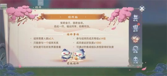 游戏中谁又没有几位热血好友呢?当大家遇到兴趣格外相投的好友,是不是有种相见恨晚的赶jio呢?这时候大家就可以体验一下游戏中的结拜玩法啦!古有桃园三结义,今有桃林三结拜。当你们的好友度达到3000时,就可以前往桃林的白衣客处进行结拜。所谓契若金兰,福运同享、劫难同当。在进行结拜之前一定要思考好哦,要知道在玄中大陆中大家可以也只能参与一个结拜关系。悄悄告诉大家,在结拜时大家还可以自由选择称号哦~小编友情提醒千万不要瞎取名,不然最终尴尬羞耻的还是你们自己哦!