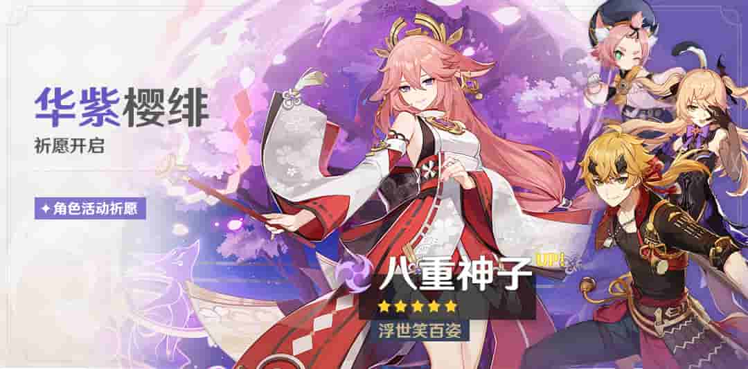 2.5 版本上线后至2022年3月28日,全新限定五星角色「浮世笑百姿 · 八重神子(雷)」将在角色活动祈愿「华紫樱绯」中迎来概率 UP,四星角色「断罪皇女!!·菲谢尔(雷)」「猫尾特调·迪奥娜(冰)」「渡来介者·托马(火)」也将加入祈愿。
