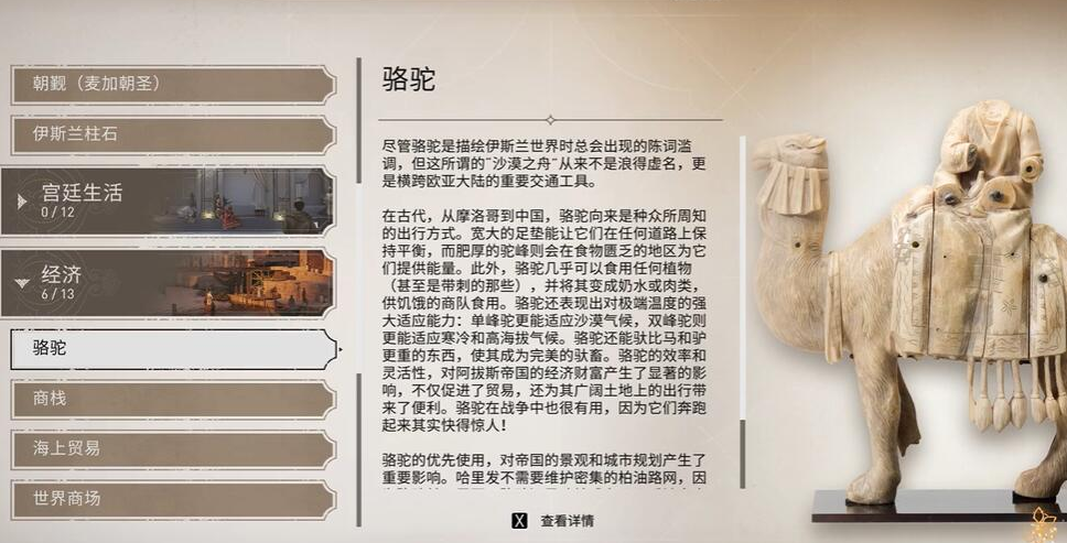 4、收集到的历史古迹骆驼在百科中的分类为经济,玩家可在百科经济一览查看骆驼详情。