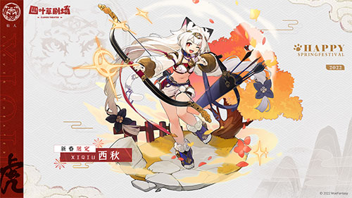 白虎作为中国古代神话中天之四灵之一,又逢壬寅年,新春限定SSR演员——西秋即将登场!神兽白虎为西方战神,五行主金,象征四季中的“秋”,所以我们将这位角色命名为“西秋”,并让她出生于东方大陆,添加了在白虎堂学习、修炼,并成为了仙人的过去,更多关于她的故事等你解锁!