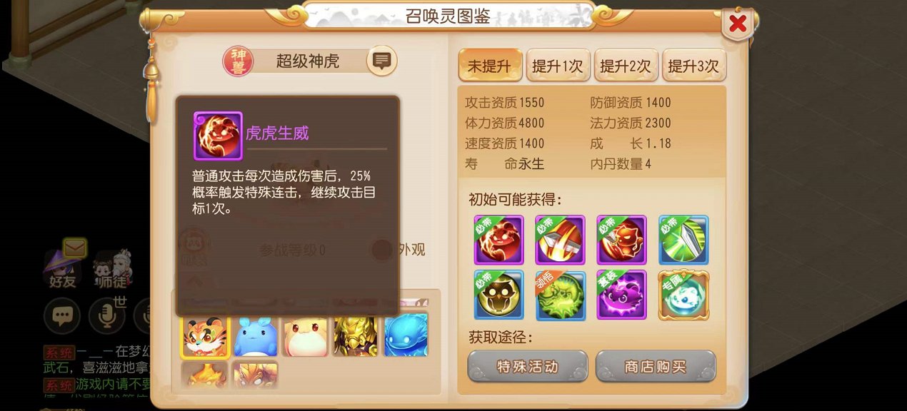 超级神虎,与梦同行。《梦幻西游》手游虎年专属神兽超级神虎共拥有五个技能,其中专属绑定技能虎虎生威能够让它在普通攻击造成伤害后,有25%概率触发特殊连击,继续攻击目标一次。若玩家将其配合连击/高级连击,则超级神虎每次出手可攻击1~4次。其专属内丹初心焰、召唤灵套装则分别提升了自身连击/高级连击以及虎虎生威的触发概率,从而使其在战斗中拥有更强大的爆发力。而超级神虎的另外两大绑定技能——高级连击和高级偷袭,更是大大强化了它的物理输出爆发力。我们相信,这只神兽一定能在之后的战斗中成为突破对手防线的重要生力军!
