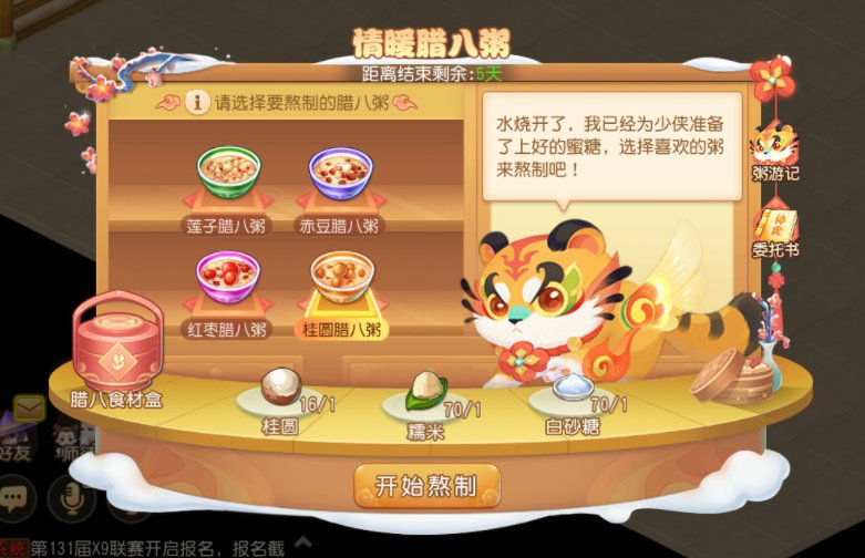 腊八粥是腊八节的传统美食,一碗热气腾腾的腊八粥曾温暖过无数行色匆匆的游子。现在,玩家只要完成师门、捉鬼、因缘绘副本、秘境降妖等日常任务,就能获取各种腊八食材。接下来,玩家可以使用这些食材,根据特定食谱烹饪出不同口味的腊八粥,并将其赠送给天命取经人以兑换各类临时符。