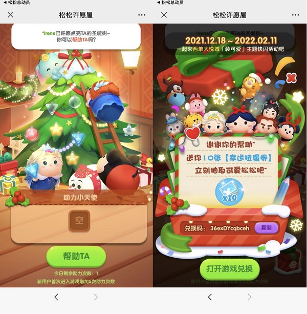 活动期间,若你总是抽不出想要的装饰物,也可以请求好友的帮忙:发送求助给你的QQ微信好友,让他帮你助力,你就可以随机得到一个新的装饰物哦!当然,好心也会有好报:帮你助力的好友也将获得《松松总动员》的神秘礼包哟。