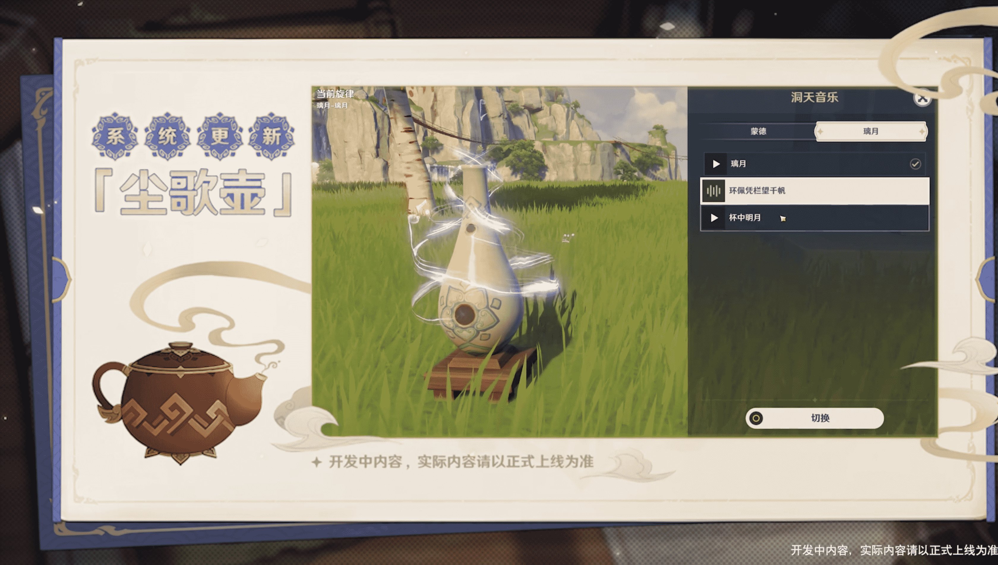 尘歌壶系统将会更新批量操作摆设的功能,旅行者可以选中一些单件的摆设进行组合,以组合的形式移动或者收纳。尘歌壶内还会新增与音乐有关的摆设「千籁至音」,旅行者可以与其交互,试听已解锁的游戏音乐,同时还可以切换尘歌壶中的背景音乐。