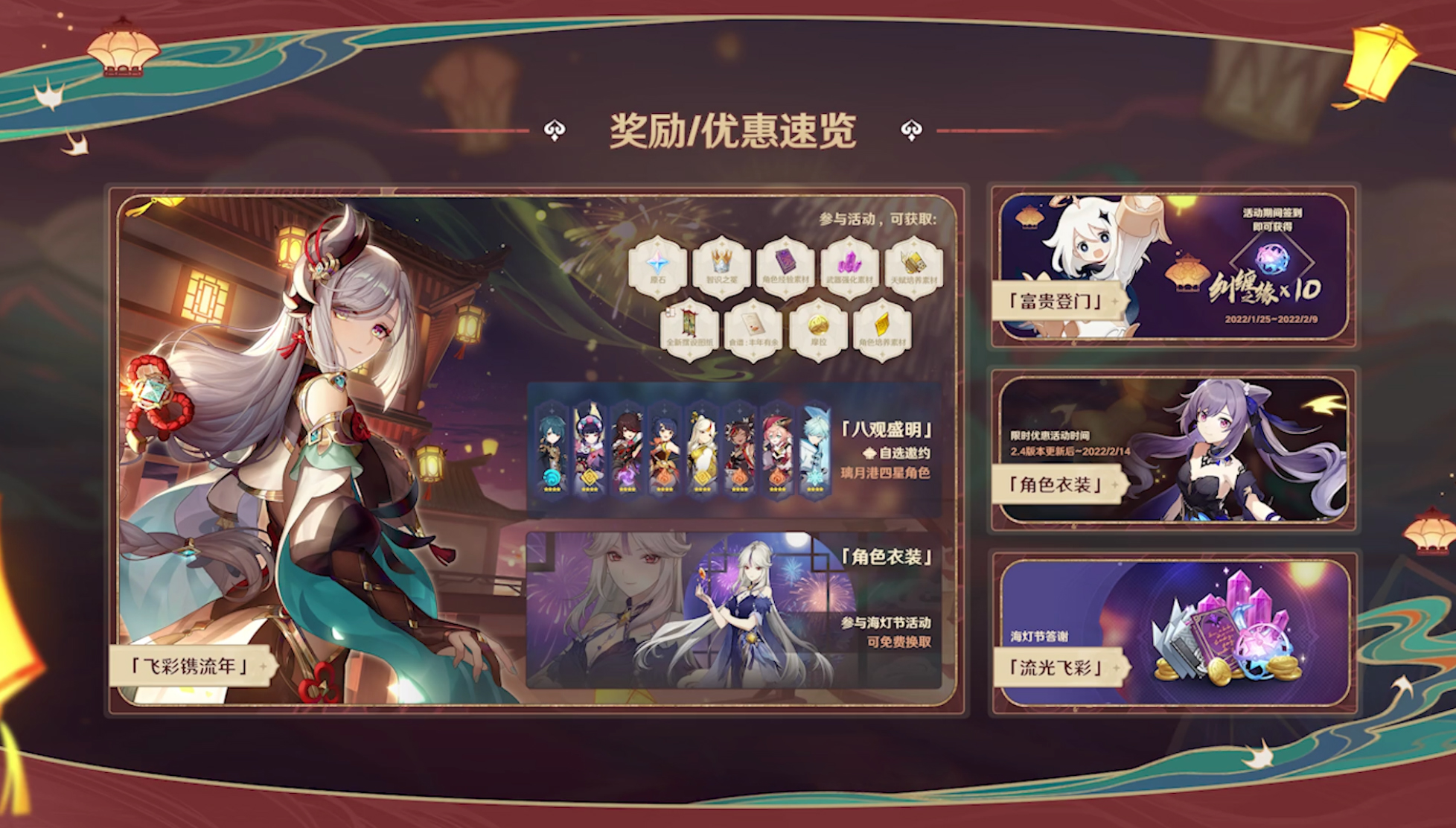此外,参与「富贵登门」累计签到活动,旅行者总共可以获得包括10枚纠缠之缘在内的丰富奖励。在海灯节即将结束之际,「流光飞彩」海灯节答谢赠礼也会通过游戏内邮件的形式发放给各位旅行者。