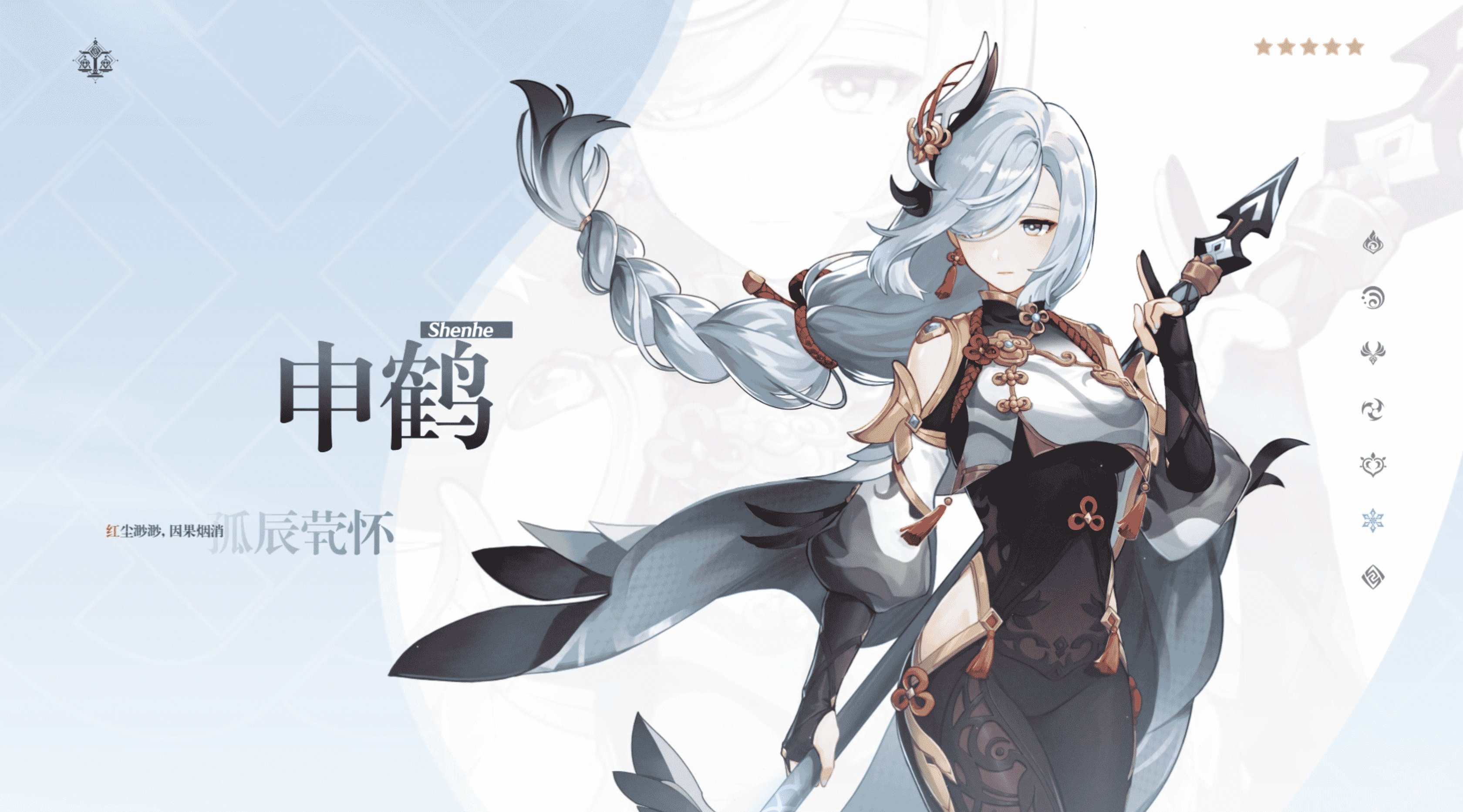 2.4版本中,全新限定五星角色「孤辰茕怀 · 申鹤(冰)」和全新四星角色「红毹婵娟 · 云堇(岩)」将加入游戏,三位人气限定五星角色「护法夜叉·魈(风)」、「循循守月·甘雨(冰)」、「尘世闲游·钟离(岩)」将迎来返场。