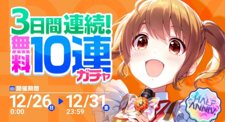 《IDOLY PRIDE》连送三天半週年免费10连抽12月26日起至12月31日这段期间内,玩家们可每日进行一次免费10连,且最多可抽得30连。开服有史以来最大手,赶快来试试手气!