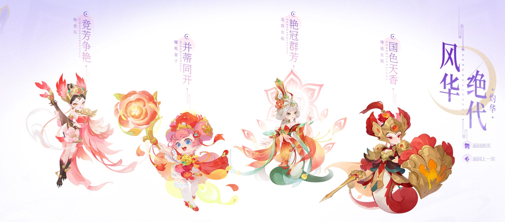月华幻衣“风华绝代”分为“灼华”和“盈心”两大阵营主题。其中,风华绝代·灼华初始颜色以红色为主,注重于展现穿戴者热烈、刚毅的一面。玩家可以让妙音鸟、蟠桃童子、灵符女娲、律法女娲身着这一套装,展现她们独特的气质。