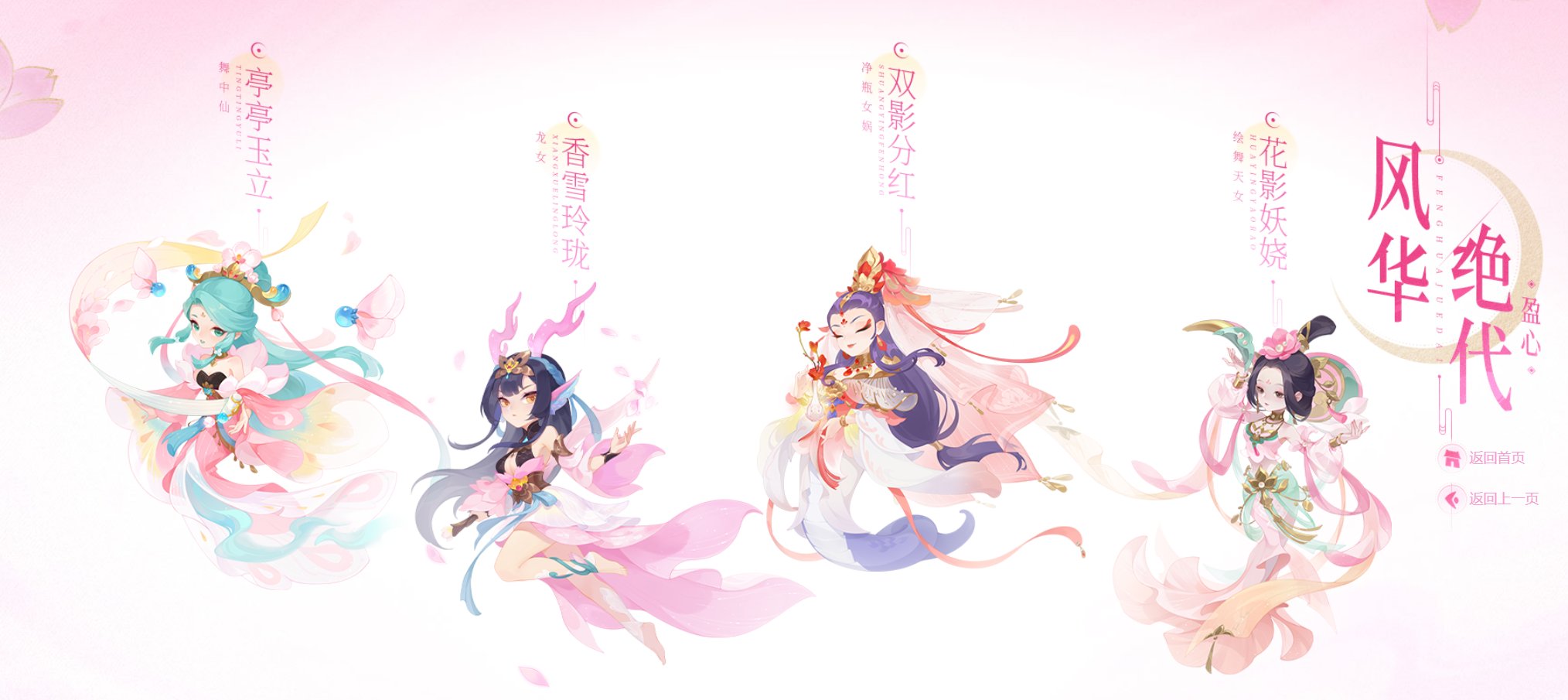相较于风华绝代·灼华,风华绝代·盈心则注重凸显雾中仙、龙女、净瓶女娲、绘舞天女的轻盈曼妙之美。以粉色为基调的衣裳,让身着月华幻衣的召唤灵显得端庄淑雅,丰姿别具。