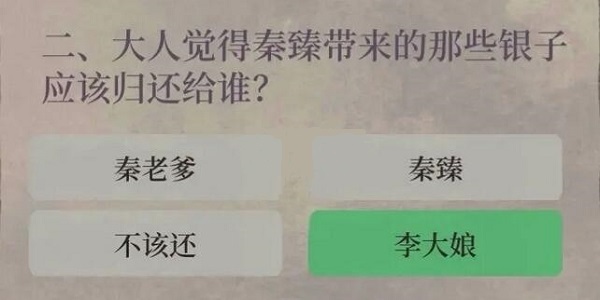 选项:秦老爹、秦臻、不该还、李大娘