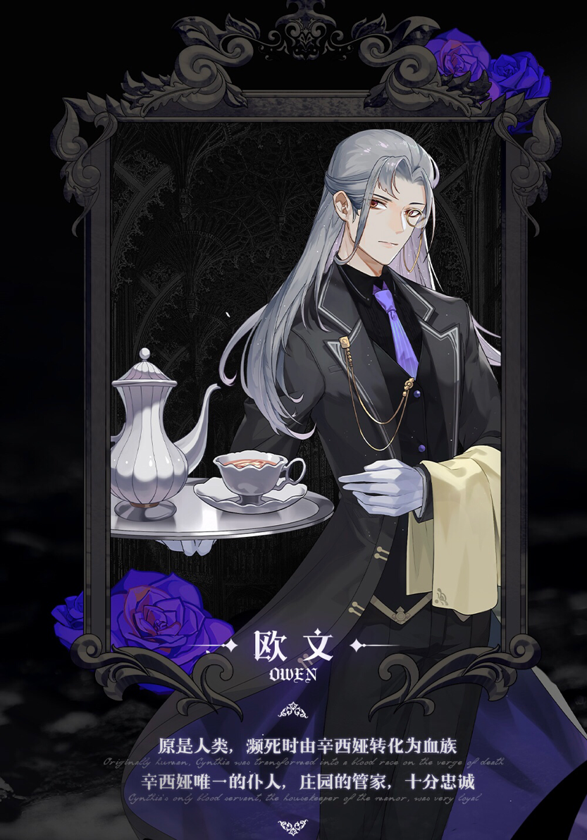 辛西娅的管家欧文,则原本是一个人类。在欧文濒死时,辛西娅救下了他,将他变成了血族。作为辛西娅唯一的仆人,欧文和她两人共同生活在城堡中,生活虽然平静,但也如一潭死水般掀不起波澜。