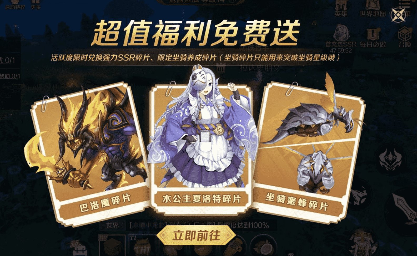 介绍完有趣的玩法,当然少不了给大家送福利~目前在神角技巧中,每日完成任务,活跃度达到一定值就能兑换SSR英雄、限定坐骑碎片等大奖,做任务的同时奖励拿到手软。还有SSR冰雪骑士艾丽莎限时登场,各位创造师千万不要错过!
