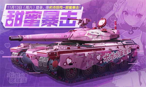11月13日,主题活动甜蜜暴击于战场开启,战士们只需完成登录任务,就能获得少女心爆棚的史诗级坦克-甜蜜暴击!
