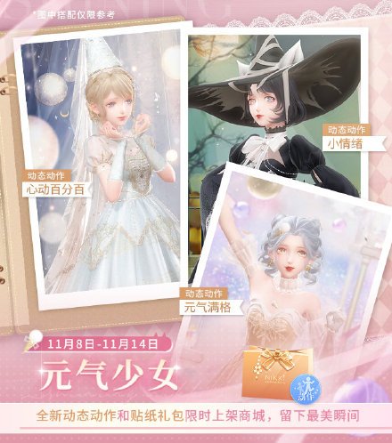 此外,11月8日至11月14日,“新意节会场”专属折扣商店限时上架,包含全新元气少女系列动态动作首发、往期资源限时复刻及各类超低折扣礼包。元气少女系列动态动作包括:“心动百分百”、“小情绪”及“元气满格”三款全新动态动作礼包,每款礼包包含全新动作、全新贴纸背景及粉钻奖励;限时复刻&超低折扣礼包包括:“咕噜噜”动作礼包、“我生气咯”动作礼包、“承让承让”动作礼包及“锦叶闻秋礼服”礼包限时复刻;“个人改名卡”、“联盟改名卡”及“美甲店改名卡”限时超值特惠,供玩家们选购。