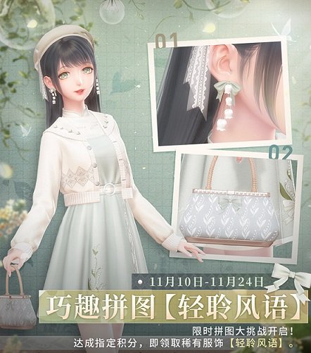此次游戏更新后至11月24日,“轻聆风语”巧趣拼图稀有服饰福利活动开启。玩家参与限时拼图大挑战,在限定时间内完成拼图即为挑战成功,成功可获得150积分,挑战失败不得分。活动期间分数累计,达到指定分数即可领取稀有服饰“轻聆风语”。