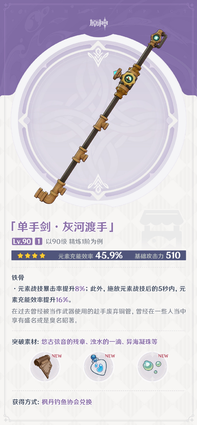 原神有很多武器可以获取,有限时获取与活动获取等,其中的灰河渡手是一把四星单手剑,下面为大家带来的具体内容,感兴趣的玩家们千万不要错过哦!