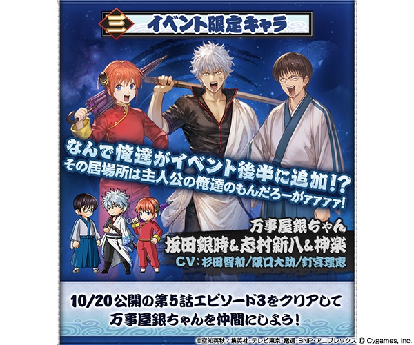 而10月20日将会追加故事任务,完成追加的第5话第3节后,角色「万事屋阿银坂田银时&志村新八&神乐」将成为同伴!
