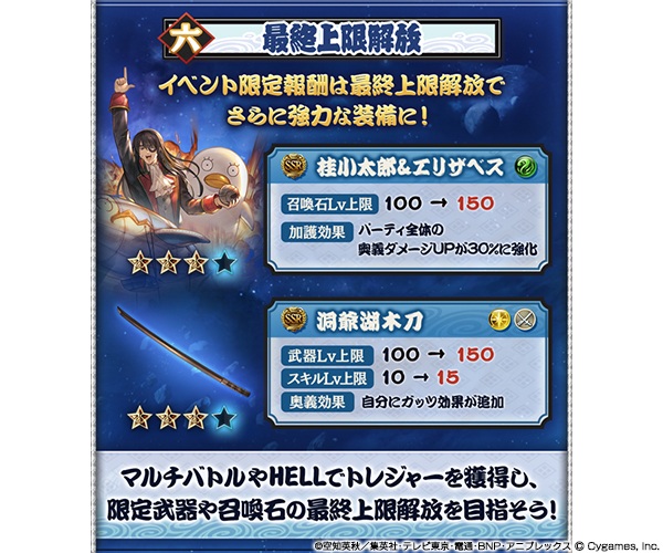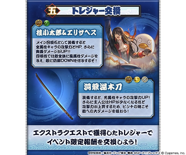 在ExtraQuest所获得的素材可获得召唤石「桂小太郎&エリザベス」和活动限定武器「洞爷湖木刀」!此外,完成「ExtraQuest」难度「HELL」和多人战中还有机会入手能让活动限定武器最终上限解放的素材。