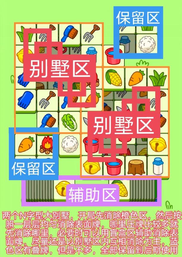 2.开局先消除橙色区的牌,这里压牌。尽量要让牌面保持在同一水平面,然后一层一层消除表面牌,不要跨层太多拿牌,等表面牌消除完后,以大别墅内互相消除为主。