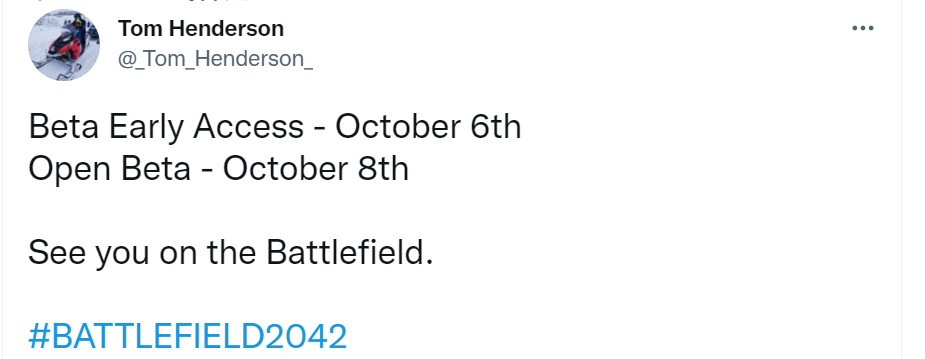 根据知名舅舅党Tom Henderson,《战地2042》BETA公测将于10月6日开始,面向预购玩家,10月8日面向所有玩家。