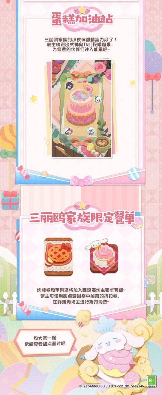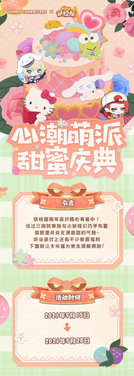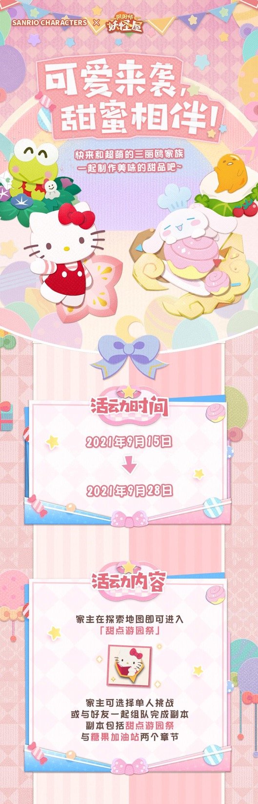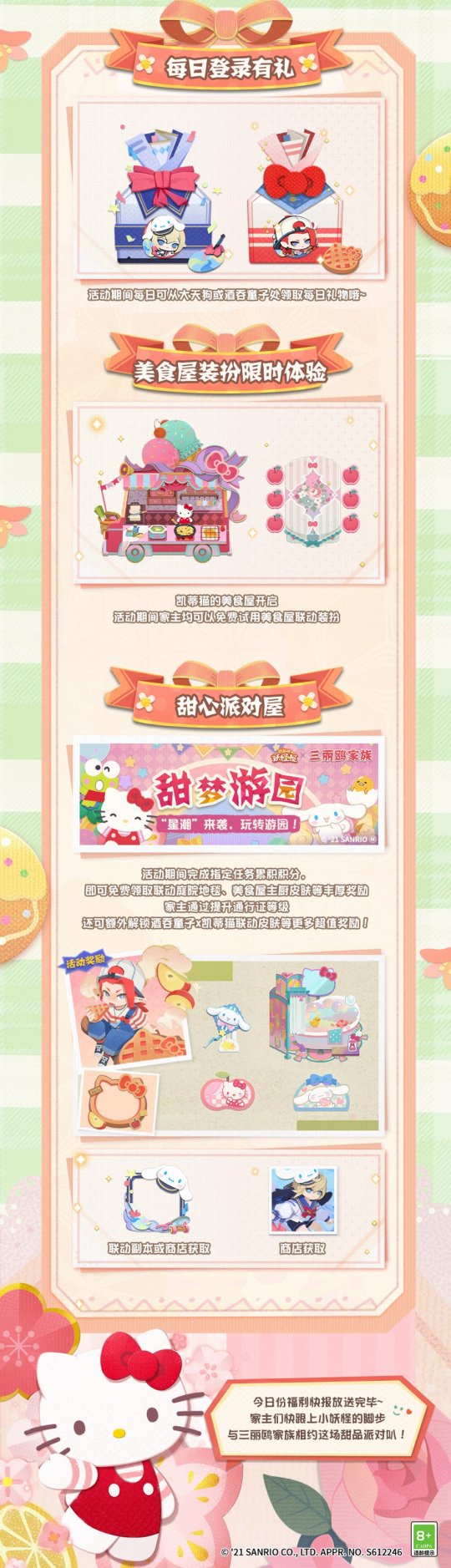 揉揉面团,撒上水果,热闹非凡的庭院里,小妖怪们和三丽鸥家族,正在如火如荼地制作着美味的甜点~家主快加入他们和大家一起做甜点吧ღゝ◡╹)ノ♡