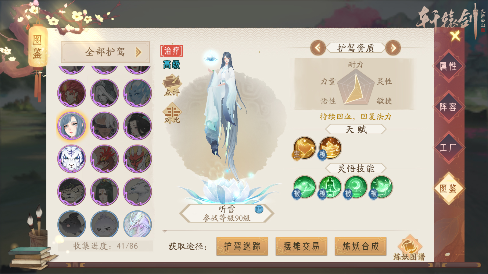 作为《轩辕剑龙舞云山》为数不多的治疗型护驾之一,“听雪”拥有强大的回复能力 。她的主动技能“聆风听雪”可以同时治疗3个己方单位,不仅可即时回复生命与法力,还能够提供持续回血。而触发被动技能“万物复苏”则可提升回复目标生命的效果!除此之外,“听雪”还拥有“悬壶济世”、“心如止水”等灵悟技能,可大幅提升治疗和控制抵抗能力,为少侠在战斗中提供坚实的保障!