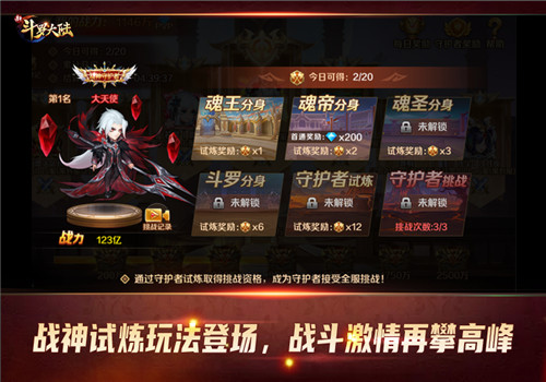 战神发起试炼,斗罗大陆的强者们将为了七个守护者席位进行为期六天的角逐,同时期间成为守护者的玩家们将生成不同难度的分身供所有玩家挑战,最终成为守护者以及挑战分身都将获得战神的海量奖励。