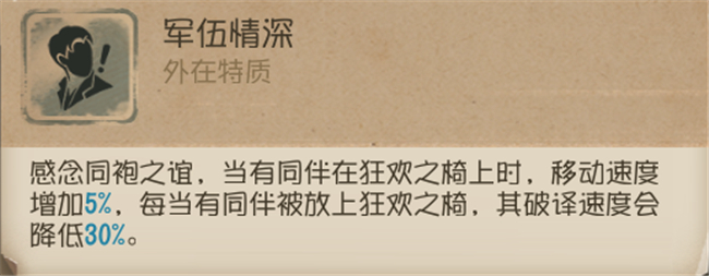 这套天赋舍弃了【膝跳反射】,因此缺少翻板带来的加速,十分考验空军的个人牵制能力。在牵制时要多利用复杂地形、板窗区域,必要时可以使用信号枪进行转点。三点【求生意志】是为了避免监管者将倒地的空军牵往远处正在破译的密码机附近,防止干扰到队友破译。