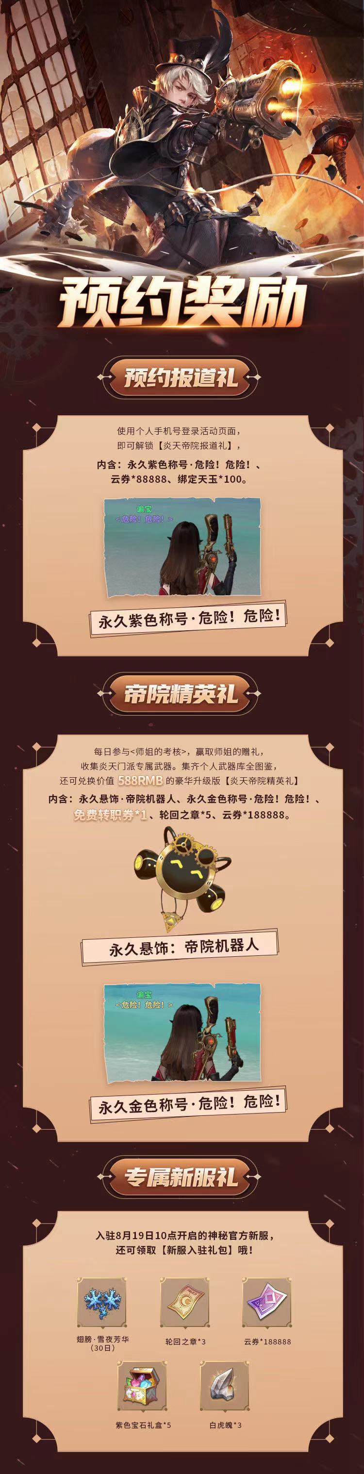 《天谕》手游全新职业炎天资料片将于8.19日正式上线,现已开启先行预约!现在炎天帝院已开启先行招生,预约即送报道礼,内含永久称号【危险!危险!】及丰厚道具礼!每日参与炎天师姐的考验,收集炎天专属武器,还可成为帝院精英,兑换永久悬饰等好礼!入驻8月19日开启的新服,更有新服入驻礼包助你快速成长!