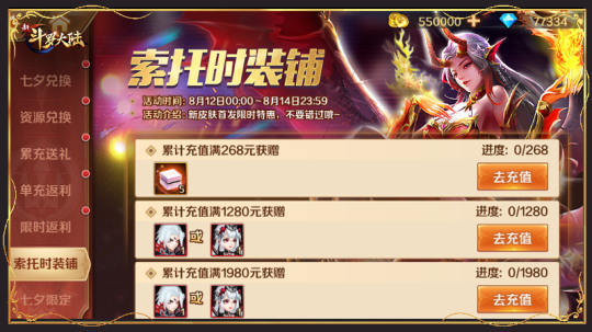 活动期间,玩家累计充值相应金额,即可获得七夕限定皮肤:缘定三生·海神唐三、缘定三生·柔骨小舞!三五组合,永远滴神,限定机会不容错过,快来参与吧~