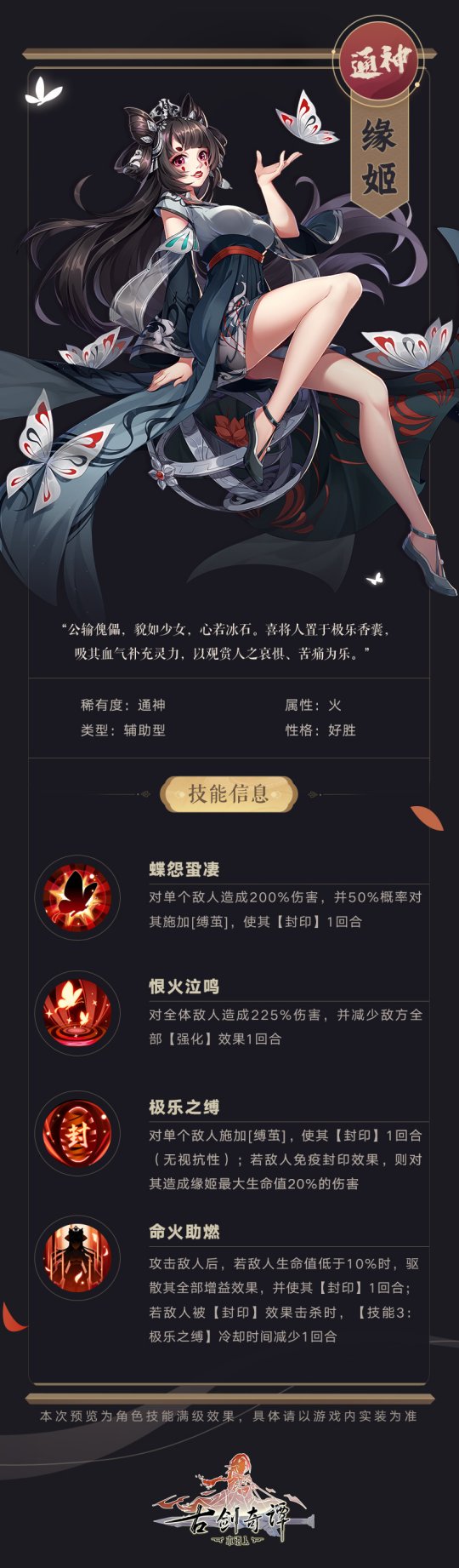 在古剑奇谭木语人中,缘姬是一位【主控制、驱散,次输出】的角色,其拥有多种单体、群体输出技能,但最有价值的还是她的控制系和驱散系技能,在战场中可以有效克制对方主要角色,使战局走向更加多变。