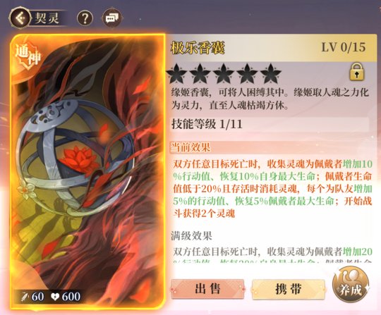 缘姬角色属于战场中的策略型角色,其主要技能以控制系为主,驱散系和输出为辅,为了保证其出手攻击频率,最优先可考虑搭配其本命契灵“极乐香囊”,香囊所提供的提升行动值和生命值的加成效果可显著提升缘姬的生存能力和出手速度;另外还可考虑协战类契灵(古蜀羽人)来增加出手几率控制对方,其余可视对战环境携带各类增攻与自身BUFF化契灵。