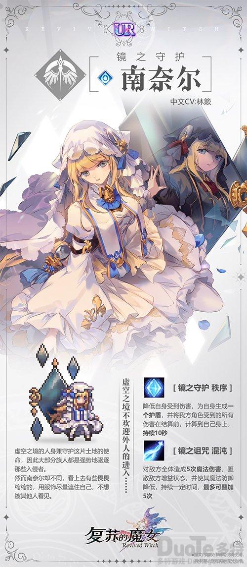 “你是……不认识的人呢。南奈尔一直在镜中睡觉,不清楚外面的事情。”人偶「南奈尔」将开启首周限时UP召唤,活动结束后将进入灵魂召唤与觉醒召唤卡池。南奈尔爱好暗中观察、睡觉、料理,被动技能是镜之反射,在受到伤害时有一定的概率释放一次镜之诅咒。